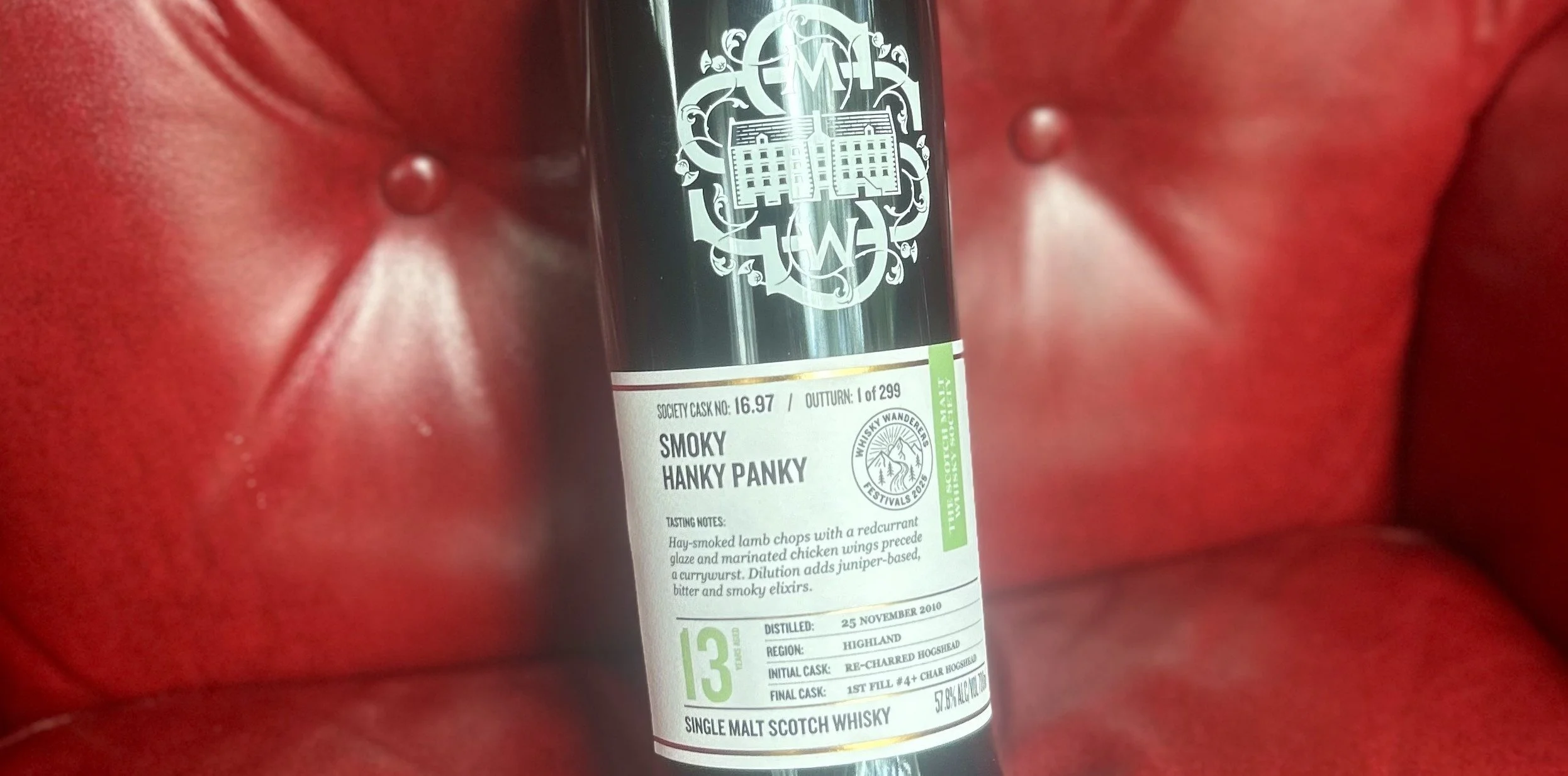 This peated Glenturret single malt from SMWS is named 'Smoky Hanky Panky,' and it was aged for a total of 13 years. The first 11 of those years were spent in a recharred hogshead, but after that, another 2 years or so were spent in a first fill heavily charred hogshead - specifically a char level of #4 or stronger. Because of that, we're expecting some strong oak and wood smoke notes to accent the already peaty distillate, so this could be an intense whisky.